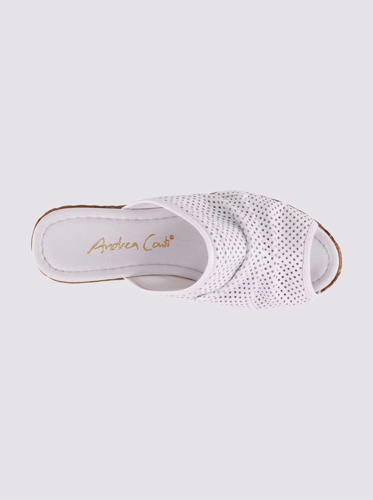 Pantolette Trendaktuell mit Lochmuster und Raffung. Aus Rind-Nappaleder. Weich gepolsterte Innensohle aus Leder. Keilabsatz, Höhe ca. 65 mm.