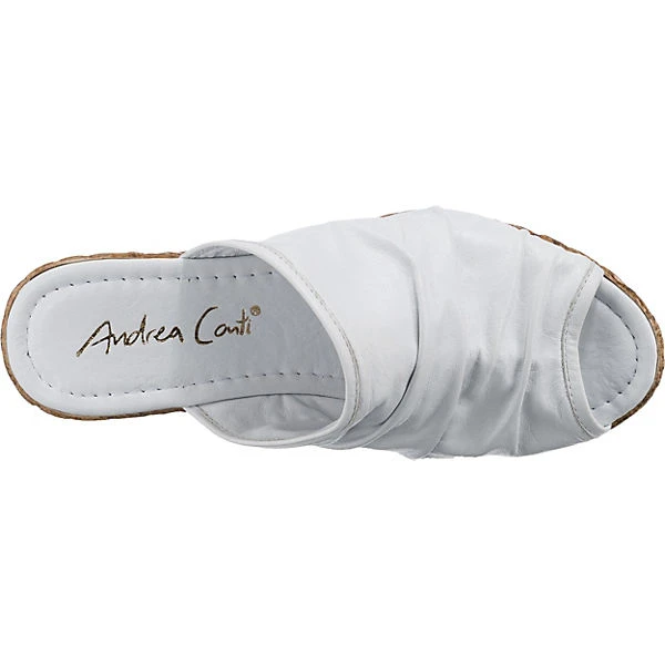 Die Pantoletten von der Marke Andrea Conti setzen einen spannenden Akzent. Der Keilabsatz sorgt für eine modische Note. Das Fußbett besteht aus natürlich atmungsaktivem Echtleder, das ein komfortables Tragegefühl unterstützt. Die Schuhe überzeugen dank des Obermaterials aus echtem und hochwertigem Leder. Es handelt sich um ein Modell zum einfachen Hineinschlüpfen.